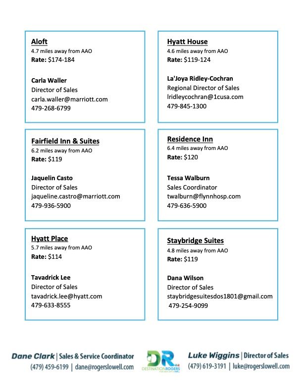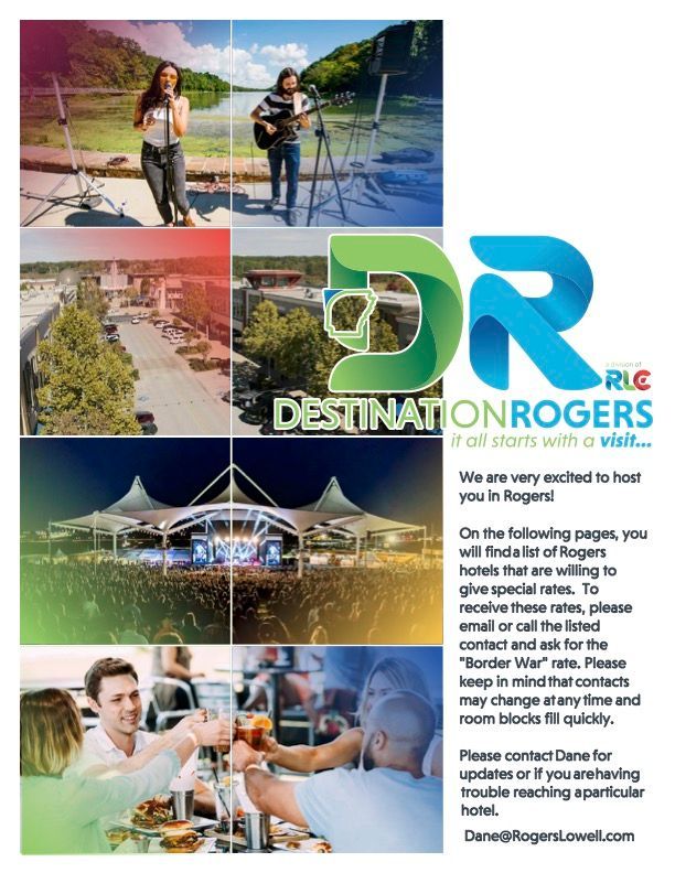 Call (479) 254-8400 to book. Say you are with AAO Border War.